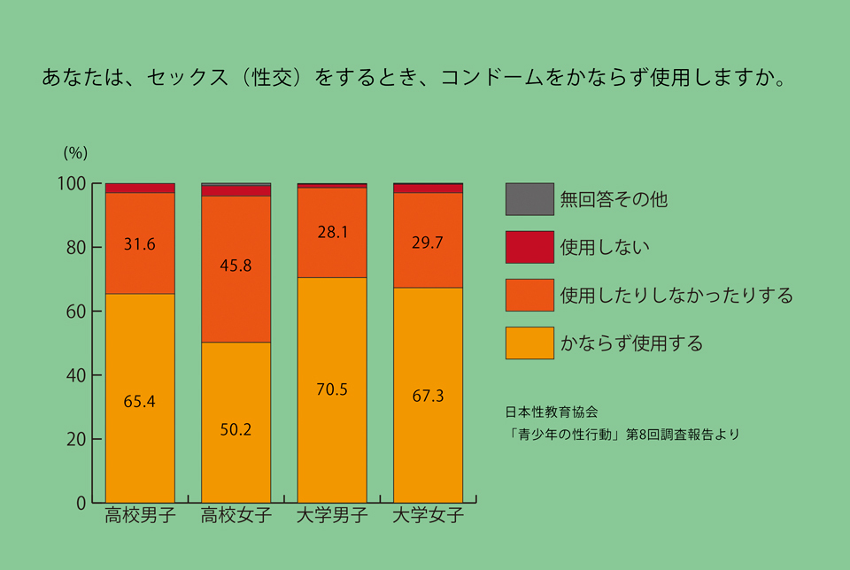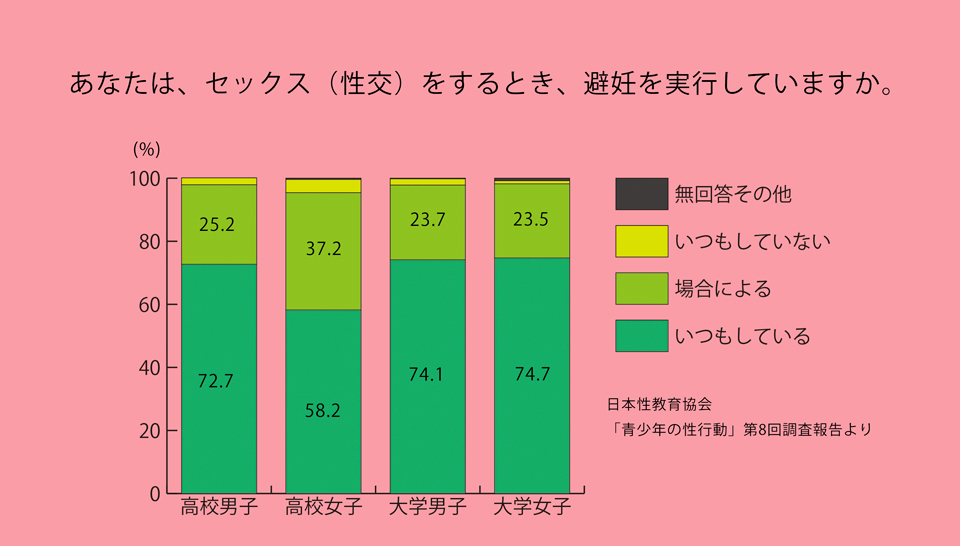 日本の高校生と大学生に、「あなたはセックスをする時、避妊を実行していますか?」というアンケートをおこなった、日本性教育協会の統計結果がある(「青少年の性行動 わが国の中学生・高校生・大学生に関する第8回調査報告」2018年8月)。