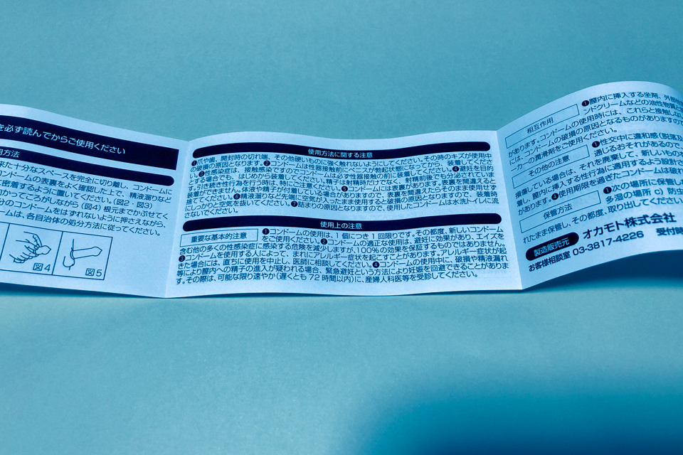 「コンドーム」の箱には、いろいろな注意書きが記してあるだろう。今まで知らなかった「コンドーム」についての詳しい情報が、そこに書いてあったりする。何より、「医療機器製造販売承認番号」というのが、本物の「コンドーム」であることの証明なので、それを確認すること。一般名称は、「男性向け避妊用コンドーム」。使用期限も明記してあるので、よく確認し、古くなったコンドームは絶対に使わないことを覚えておこう。