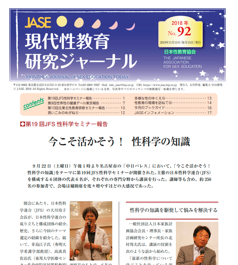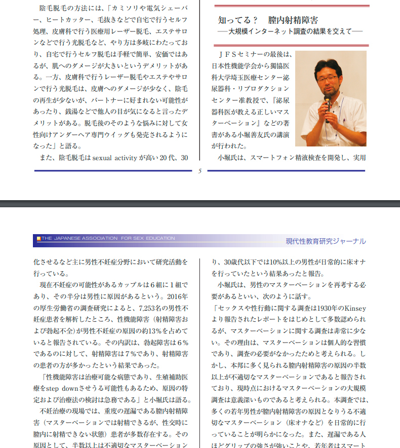 2018年11月に発行された一般財団法人 日本性教育協会(JASE)の月刊機関誌『現代性教育研究ジャーナル』(No.92)には、男性のマスターベーション(自慰)に関する興味深い内容が記されていた。それは同年9月、名古屋市でおこなわれた「第19回JFS性科学セミナー」(主催は日本性科学連合)で講演された獨協医科大学埼玉医療センター泌尿器科・リプロダクションセンター准教授・小堀善友氏の「知ってる? 膣内射精障害―大規模インターネット調査の結果を交えて―」の内容である。