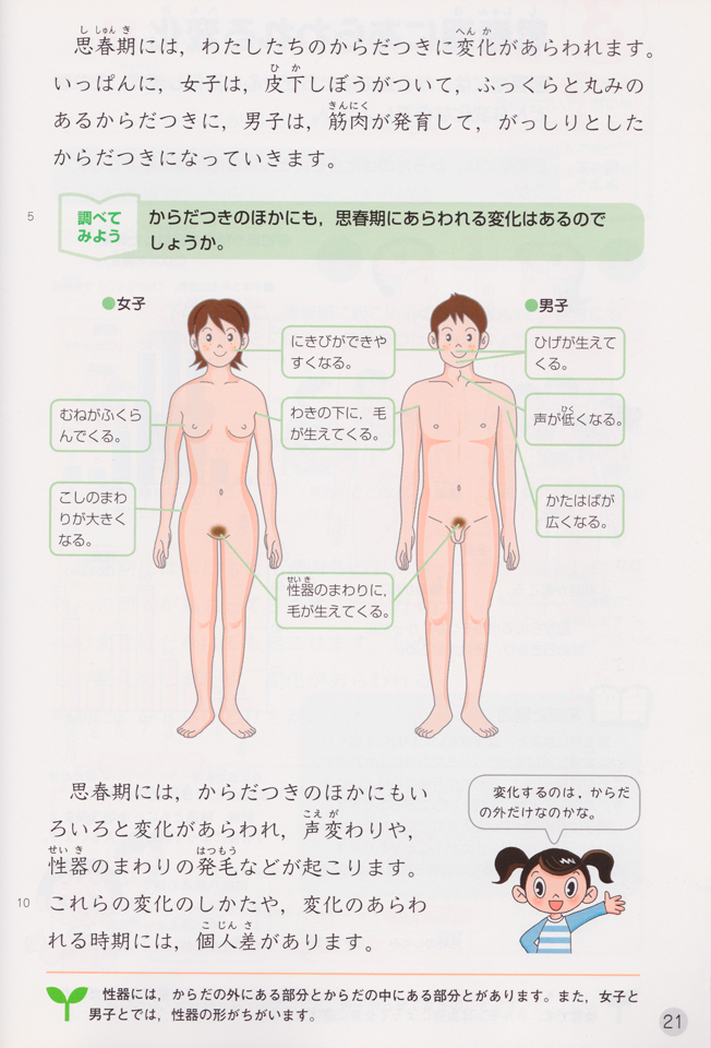 小学校で習う「月経」と「射精」については、生殖器官の成長と発達の過程でほぼ最初に自己が体験する不安と動揺であったことを、大人達は既に遠い過去の出来事として忘れてしまっているかも知れない。が、しっかりと思い出して欲しい。それは誰のからだにも起こること。起こる時期には個人差があること。そして何より、決して恥ずかしいことではないということ。