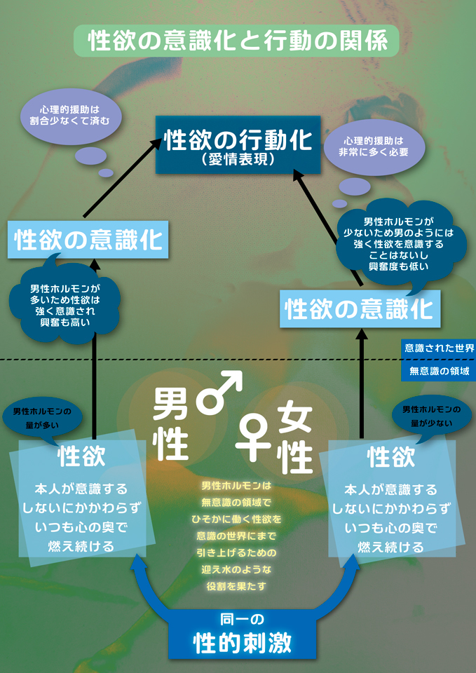 実はこれは、男性ホルモンの増量がさせることなのである。男性ホルモンは、人に異性を意識させる源であって、男でも女でも男性ホルモンの存在なしでは、異性、すなわち性というものを意識することはないのだ。幼い子ども達が性を意識せず、男の子でも女の子でも無邪気に遊べたのは、男性ホルモンが男の子も女の子も少なかったからであり、思春期とともに人の心に生ずる異性への意識は、男性ホルモンの増量がさせることなのである。