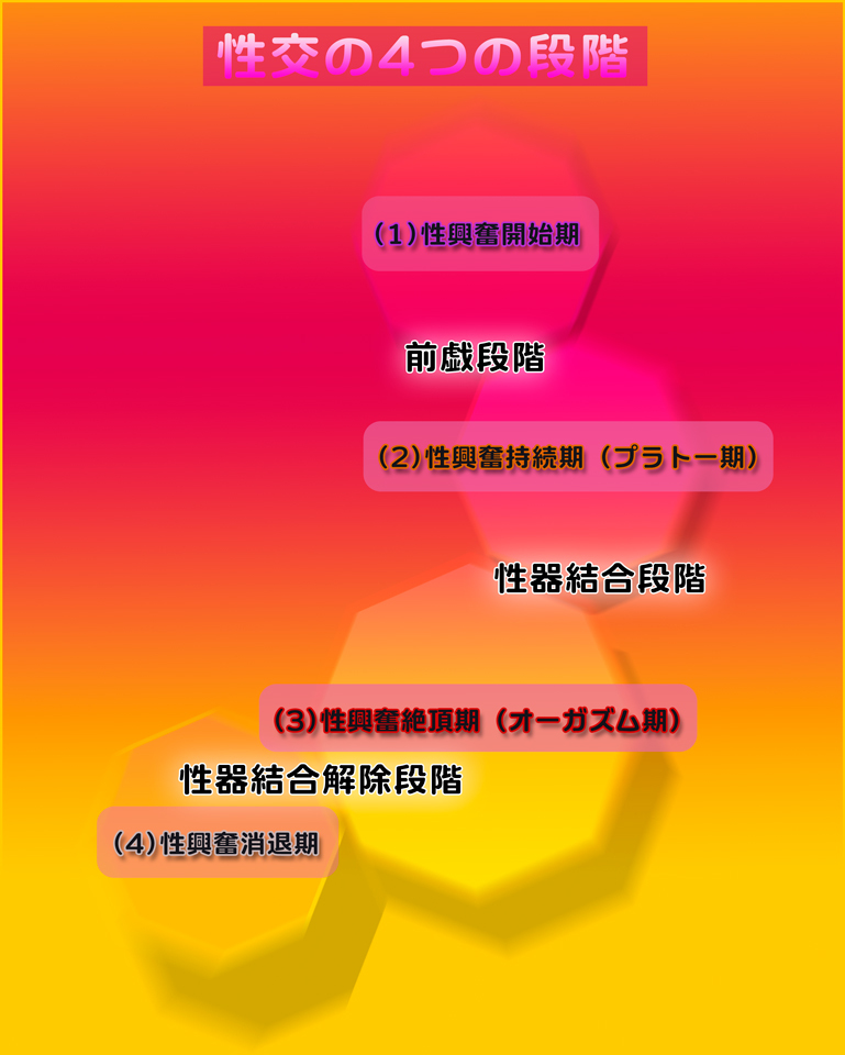 おおむね性交は図表に示したように、4つの段階を経て始まり、終わる。