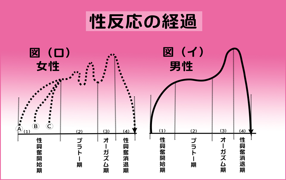 男女それぞれの性反応の経過を図で示した。2つの曲線は全体の流れとして同じようであるが、細かい点で男女に差があることが分かる。