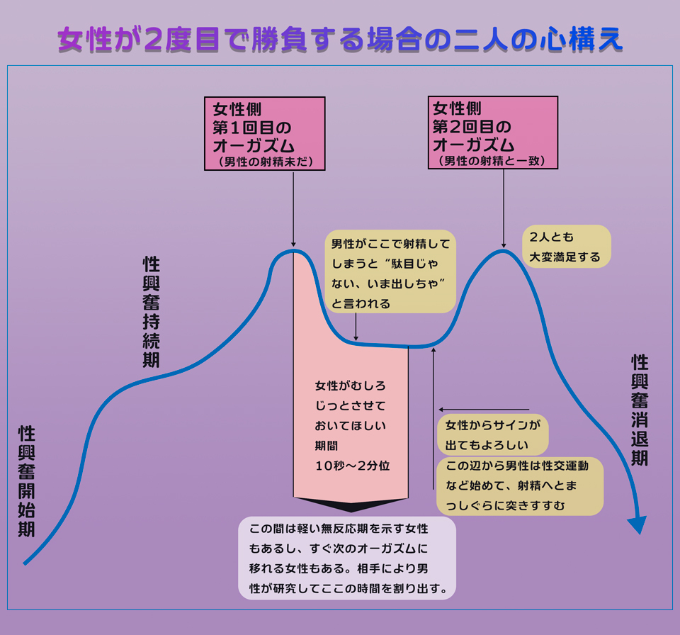 この無重力に似たふわふわした状態のことを、フライング・センセーション(飛行感)とか、フローティング・センセーション(浮遊感)と呼ぶが、オーガズムにおける快感の中心をなすのは、この感覚に身を委ねた時の快さである。すなわち、性交における満足とは、二人が同時に、この無重力に似た浮遊感に包まれきれたことを指す、と考えればいい。オーガズムに達すると、二人は興奮消退期に入り、性興奮はみるみる冷めていくが、とりわけ、男性の冷め方は女性よりも早いことになっている。