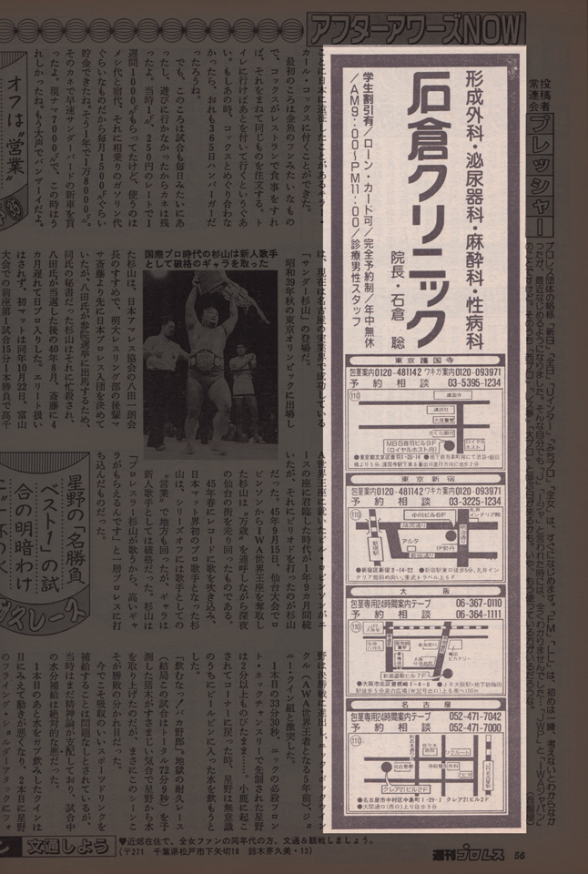 その熱烈さが、ここでは問題となる。とどのつまり、プロレス・ファンの若い男子にとっては、週プロを貪り読むことで、どうしても“ある事”で相対的に「悩み」が増長されてしまうことがあった。その“ある事”とは、「包茎」治療の広告であった。