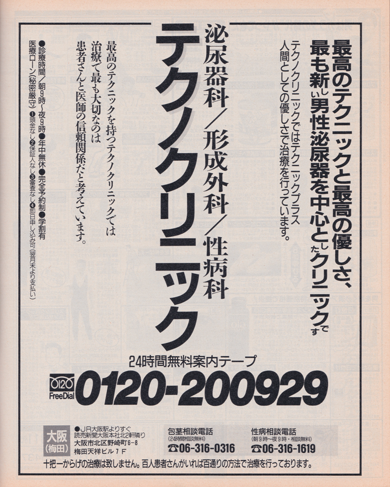 さて、この1冊の週プロの中に、どれだけ「包茎」手術を促す泌尿器科・形成外科クリニックの広告があるか。要は、その広告の数をカウントしただけなのだが、この号では、5つあった。①コスモクリニック、②神奈川クリニック、③石倉クリニック、④東京上野クリニック、⑤テクノクリニック。言わずもがな(あるいは哀しいかなと言うべきか)、週プロ愛読者なら、この5つのクリニックの社名はすべて覚えているだろう。何故ならほぼ毎号、同じ様な広告が掲載されていたのだから。