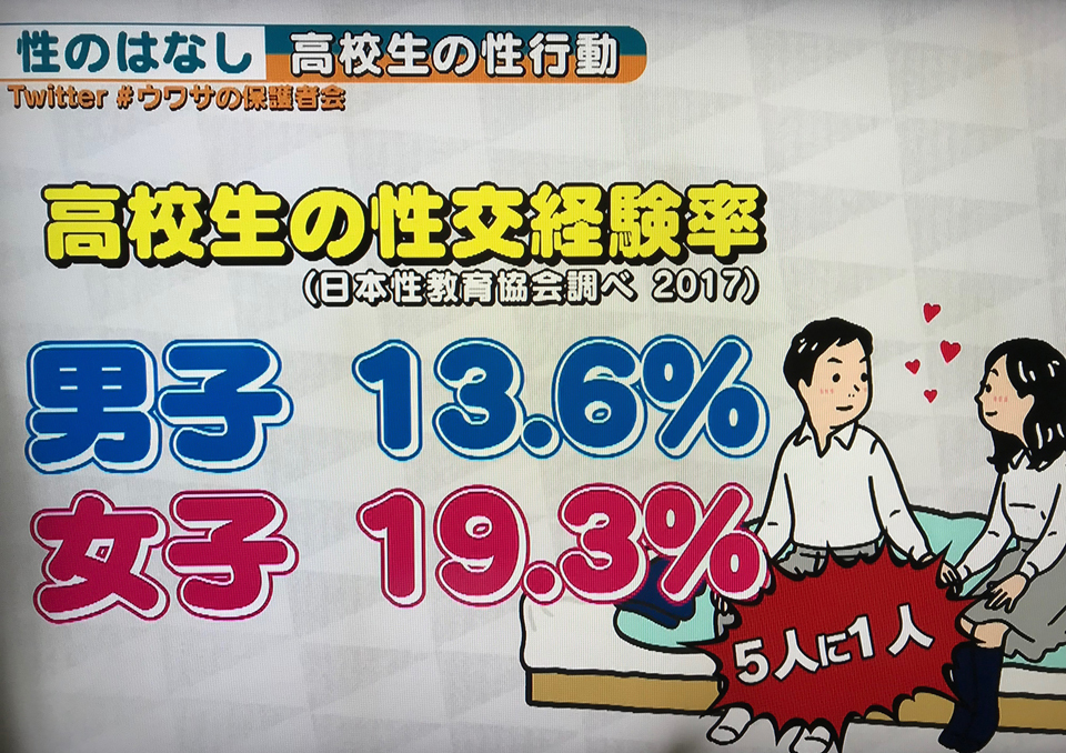 高校生の「性交経験率」の調査結果に危機感を抱くスタジオ内の保護者達。日本性教育協会調べによると、2017年の高校生の「性交経験率」は、男子が13.6%、女子が19.3%だという。これは5人に1人の割合で「性交」を経験していることになる。高校生の性行動の実態に関しては、番組独自の調べによると、男女とも半数以上が「キス」を経験し、4割以上がパートナー同士で「添い寝」をしている、そうだ。