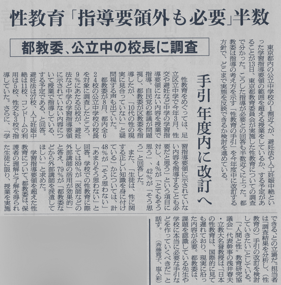 今月14日付の朝日新聞朝刊の社会面で、「性教育『指導要領外も必要』半数」という記事が掲載された。記事の内容を要約すると、東京都教育委員会が8月に実施した中学校の性教育に関する調査で、都内624校の公立中学校の校長を対象に調査した結果、42%の校長が「学習指導要領に示されていない内容を指導することも必要だと思う」の項目に「そう思う」と答えたという。