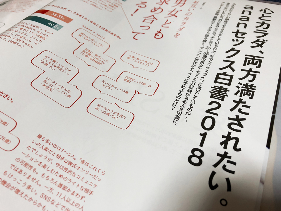 「心とカラダ、両方満たされたい。ananセックス白書2018」のページでは、セックス経験のある20歳から35歳の男女を対象にしたアンケート内容が記されている。詰問事項はほとんど端的で分かり易い。
