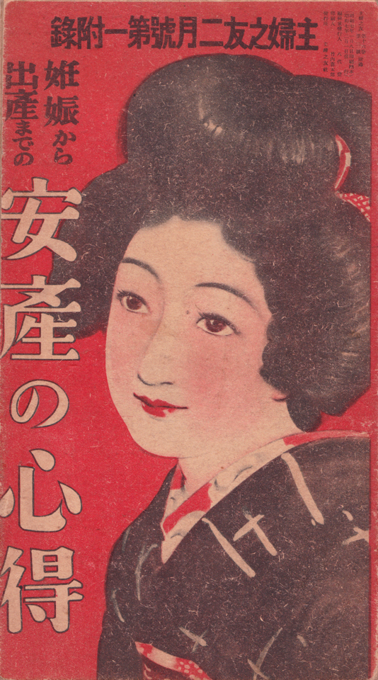 それは、昭和7年(1932年)に発刊された雑誌『主婦之友』(主婦之友社)2月号付録の、「妊娠から出産までの 安産の心得」。いわゆる妊娠と出産の手引き本である。屏風のように折り畳みられた全78ページ(裏表合わせて)の小冊子で、大きさは縦19センチ、横10.5センチと小さめ。まあなんとか携帯できるサイズである。この大きさだと、妊婦さんが枕元に置いておくのに都合がいいだろう。