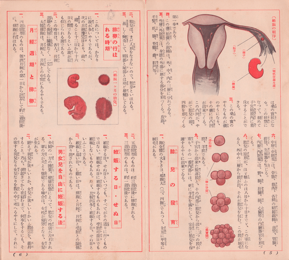 次の文章がまたすこぶる興味深い。《三、夫は肉食を主として精力を旺盛にし、妻は菜食を主とすると、精力の旺盛な夫と同性の男児が生れる》。《四、男児を受胎し易い月と、女児を受胎し易い月があるから、それを考慮に入れること。一月二月三月は、男児を受胎し易いやうである》。こういった記述から当時の男尊女卑の通念が読み取れるが、軍国主義だった配下で、やはり女子よりも男子を優遇し産めよ、という意志にならざるを得なかった社会であった。《五、雑念を払つて、受胎時は目的のために努力すること》。《六、受胎時日に因つて、男女性別が決定するといふ説》。ちなみに、この小冊子の監修者なる専門医の実名はどこにも記されていないのである。