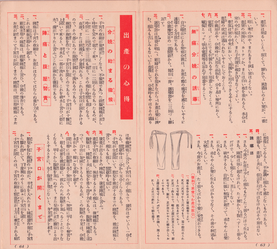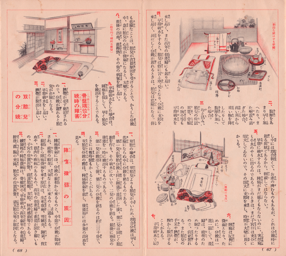 「赤坊の衣類の準備」では、美しいイラストで赤ちゃん用の季節ごとの衣類が記されていたり、寝具なども。「出産の心得」の全14項目のページともなると、俄然、緊張感が伝わってくるような記述が増える。「分娩の始まる徴候」、「陣痛と腹圧(努責)」、「子宮口が開くまで」、「お産の経過」、「分娩前の注意」、「産婦の覚悟」、「早期破水の原因」、「骨盤端位分娩時の障害」、「陣痛微弱の原因」、「陣痛を強める法」、「陣痛の過激な場合」、「分娩中の異常出血」、「産婆の間に合はぬ時の注意」。