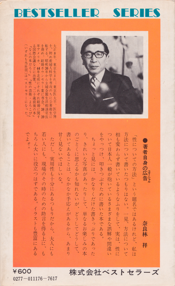 奈良林氏の顔と略歴は、本の裏にある。《大正8年、東京生まれ。東京医大卒。医学博士。初め産婦人科学を専攻のちに公衆衛生に転ずる。昭和36年から主婦会館生活相談室長を務め、結婚カウンセラー業に専念…》。小学生の頃、サラブレッド・ブックスから出ていた『恐怖の心霊写真集』の著者である心霊研究家・中岡俊哉氏とならんで、SEX本の“ナラバヤシ”の名はけっこうませた友人との間で飛び交い、有名であった。
