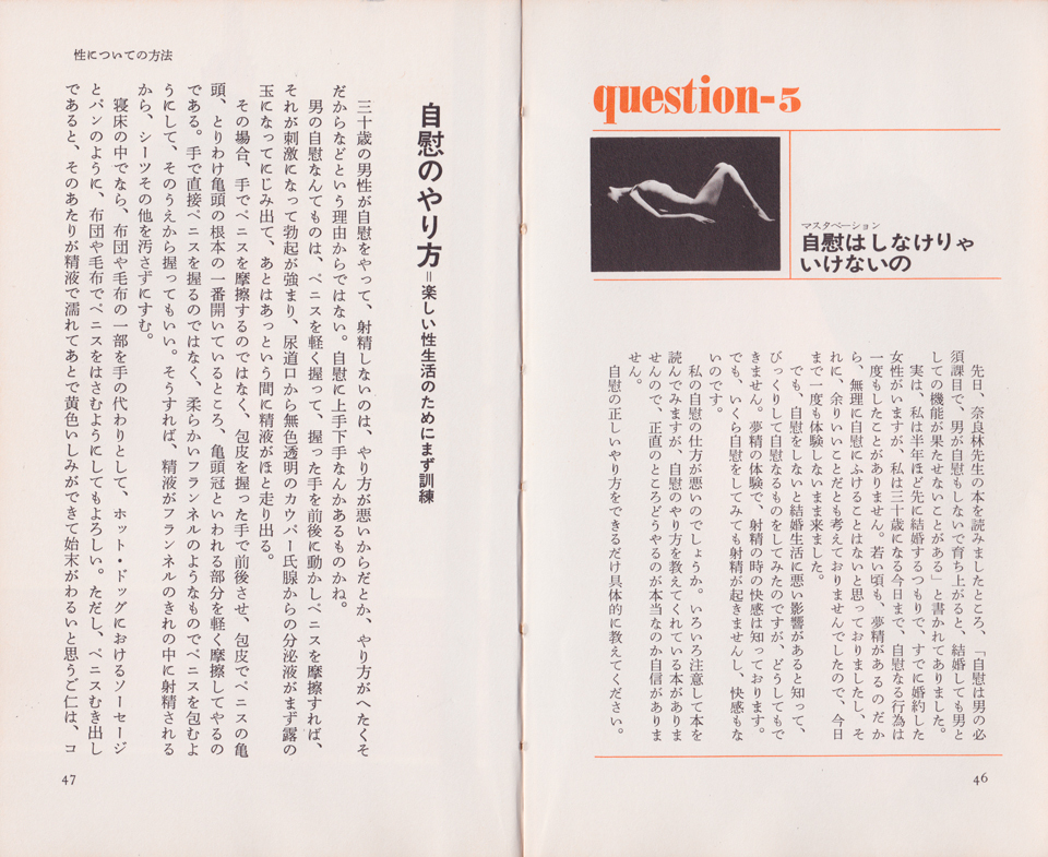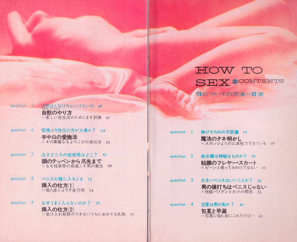 あの当時もっとしっかりとそれを読むべきであった――ということで後悔する。目次を見ていただけると、ある程度内容が想像できるかと思われる(※question 1からquestion 9、さらにこの後も続いてquestion 24まである。後半では射精についての疑問、体位についての解説、膣の美容体操、失敗しない避妊法などがある)。