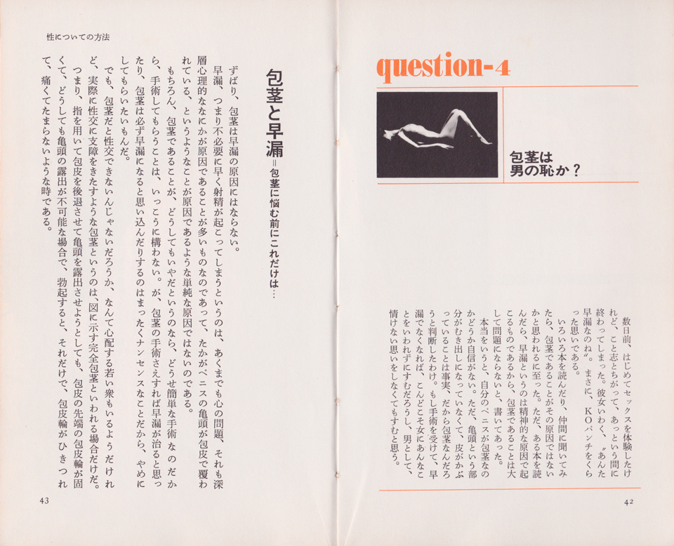 さて、ここからは「包茎」と「自慰」のページに着目して、その正しい知識を紹介したい。まずは「包茎」について。question 4の「包茎と早漏=包茎に悩む前にこれだけは…」が「包茎」に関する解説となっている。