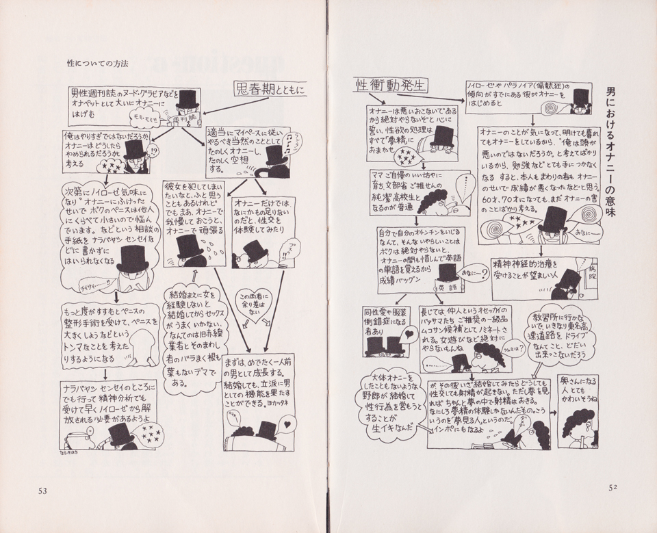 また、こうも付け加えている。《寝床の中でなら、布団や毛布の一部を手の代わりとして、ホット・ドッグにおけるソーセージとパンのように、布団や毛布でペニスをはさむようにしてもよろしい。ただし、ペニスむき出しであると、そのあたりが精液で濡れてあとで黄色いしみができて始末がわるいと思うご仁は、コンドームを使えば汚さずにすむし、それなりの臨場感も味わえよう》。