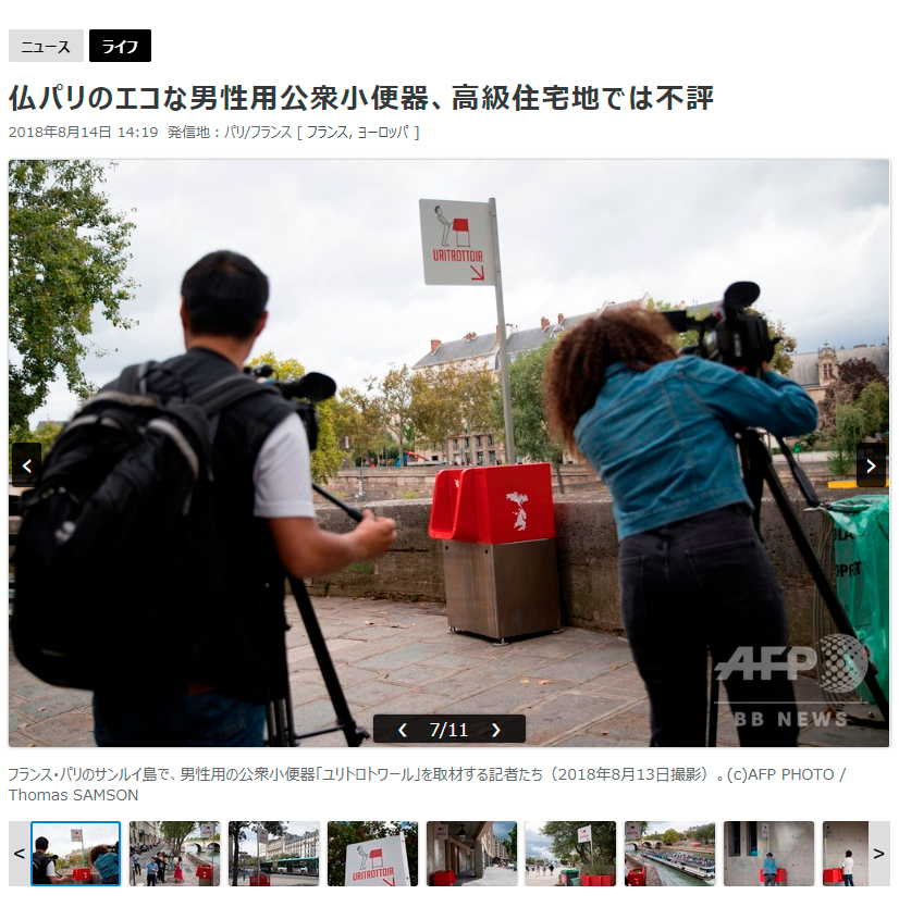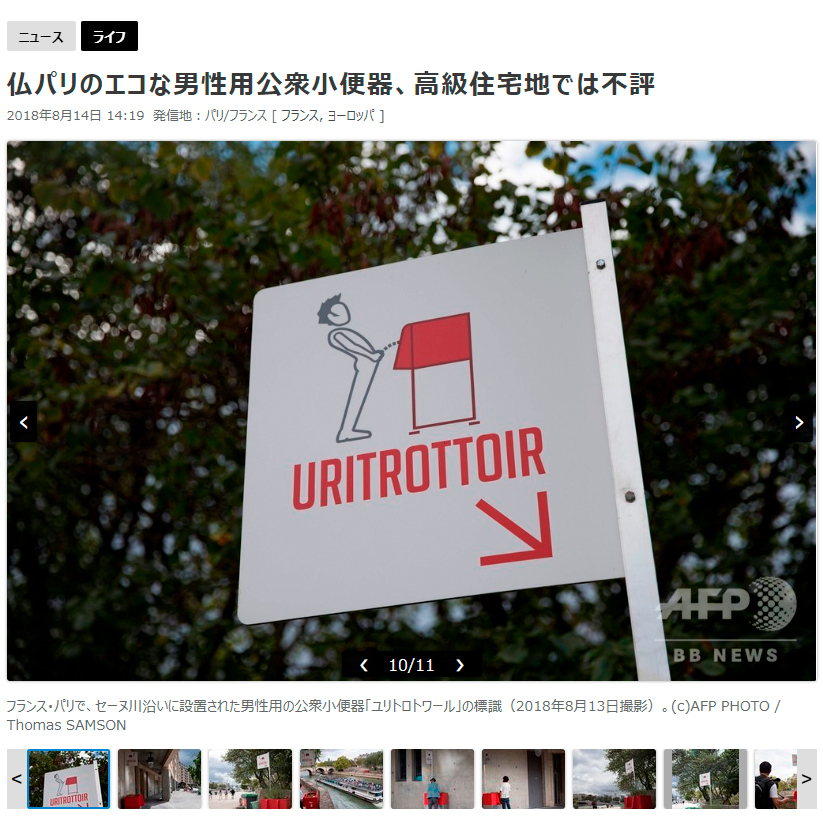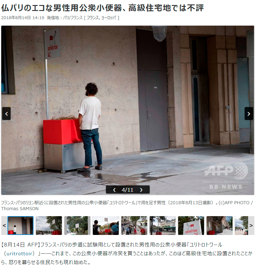 8月14日付AFPBBニュース(生活関連)によると、フランスのパリにて、奇妙な形をした箱型の「男性用小便器」が試験的に街に現れ、大変話題になったようである。それは「ユリトロトワール」(uritrottoir)と名づけられたエコロジカルな小便器で、材質はおおむねアルミ製。上部は赤い色をしていて、外観はどう見ても公衆用のダスト・ボックスである。内側に堆肥となるわらが詰められているらしく、水を使わず乾燥して悪臭もないとのこと(画像を見たところ、ものによっては雑草が生えているのもある)。