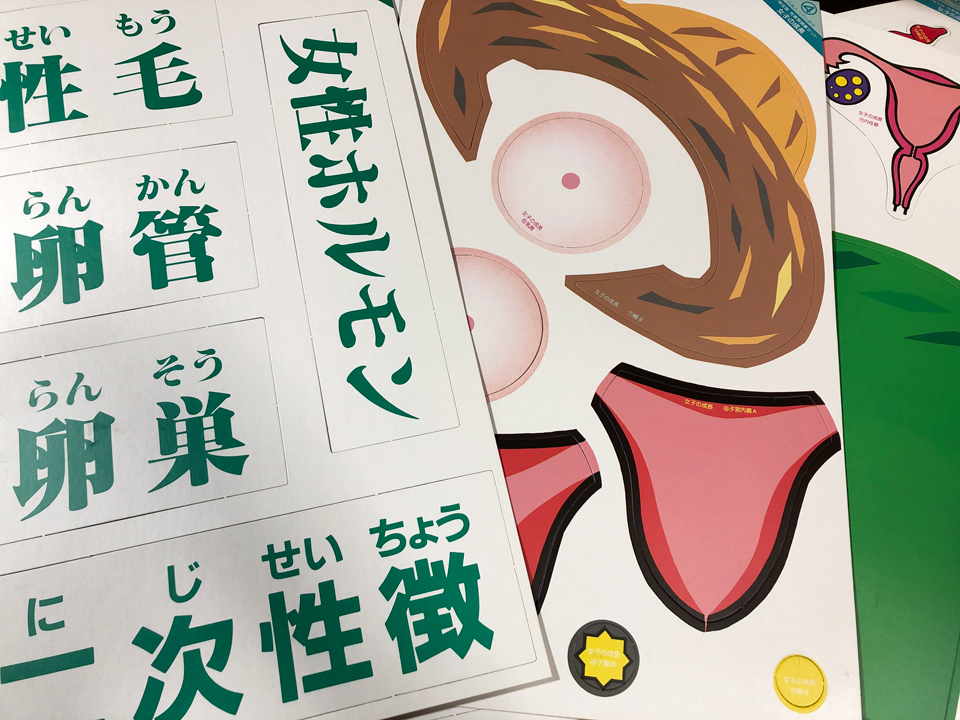「小学生版 性教育授業セット 女子の成長」は、文字通り、女子の成長期における体の変化を教えるのが主目的である。セットの中身は、体の図版や子宮などが描かれたマグネット付パーツ、「女性ホルモン」や「卵巣」といった言葉が描かれたマグネット付文字プレートとなっているが、各パーツや文字プレートはあらかじめ切り取ってから使うことになる。それぞれの部品の裏側にはマグネットが付いているので、黒板やホワイトボードに部品を貼り付けながら、視覚に富んだ実践的な授業をおこなうことができる。