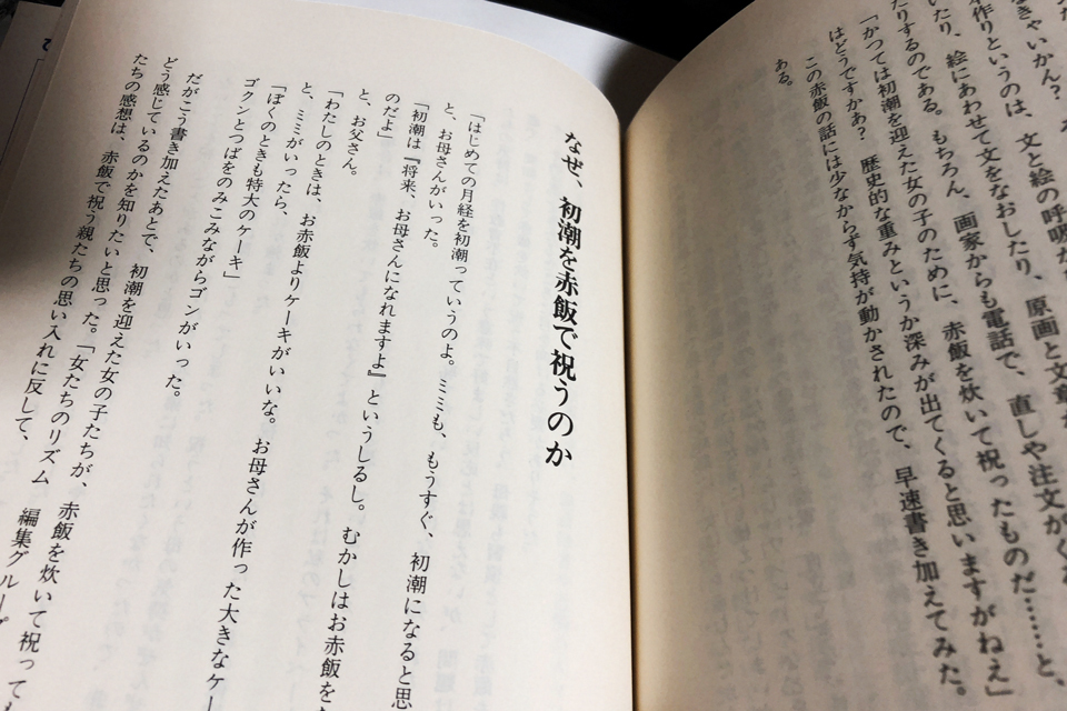大人の方は、子どもが初経をむかえ、からだが大人になりつつあることをしみじみと感慨深く喜ぶのだろう。しかしその子どもは、自分のからだに何が起こったのか、まだ戸惑ったままである。からだの異変の不安な気持ちがあるうちは、誰に祝われようと嬉しいとは思わない。これがもし、男子の「精通」で同じように家族で赤飯を囲んで祝われたとしたら、あまりに気恥ずかしくてこんな嫌な体験はないと、私自身はそう思うのだ。