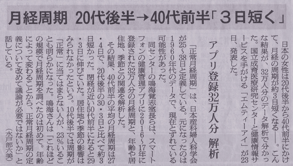 2020年1月25日付朝日新聞夕刊に、こんな見出しの小さな記事が掲載された。「月経周期 20代後半→40代前半『3日短く』」――。