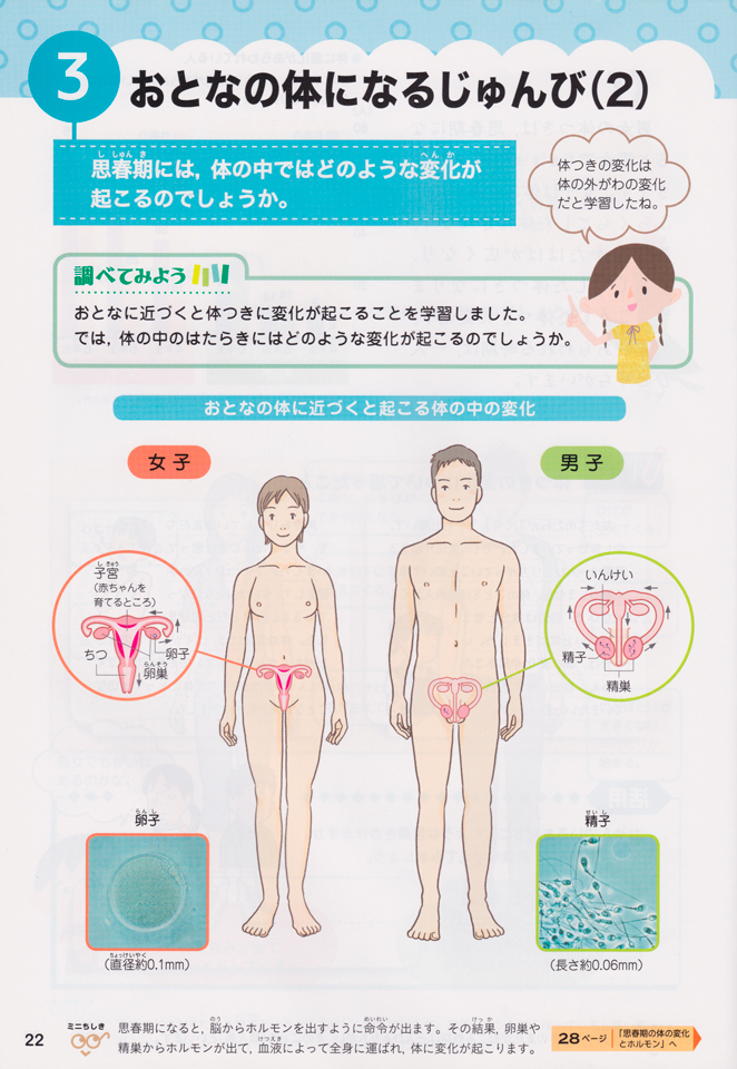 《女子では、思春期になると、月に1回ほど卵子(命のもと)が卵巣から出されて子宮へ運ばれます。そのとき、子宮では内がわのまくが栄養をふくんだ血液であつくなります。そのまくは、しばらくするとはがれて体の外に出されます。このようなしくみを月経といい、はじめての月経を初経といいます》