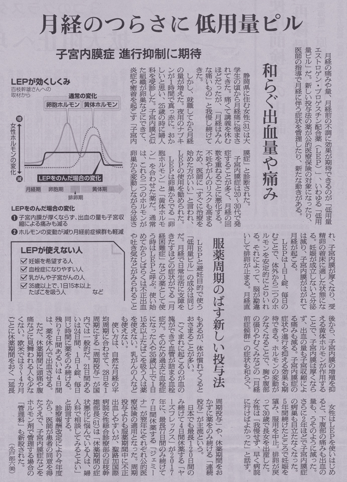 2020年4月15日付朝日新聞朝刊の「月経のつらさに低用量ピル」の記事では、「低用量ピル」(LEP)が子宮内膜症の抑制にも効果があるとして、月経不順や月経痛を改善する旨の内容が記されていた。またその場合の新しい投与法が、公的医療保険の対象にもなっている旨が記されている。