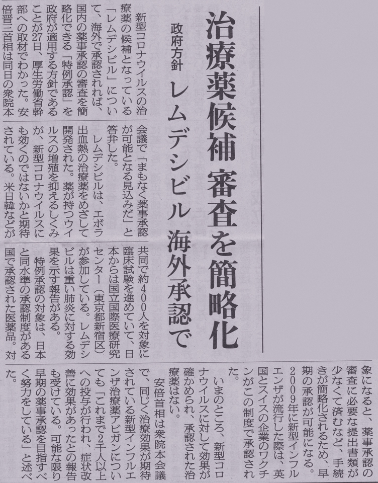 朝日新聞の厚労省幹部への取材によると、新型コロナウイルスの治療薬の候補であるレムデシビルが海外承認されれば、国内の薬事承認の審査を簡略化できる「特例承認」によって、適用が認められる方針であるという。レムデシビルはエボラ出血熱の治療薬で、細胞に入ったウイルスの増殖を抑えるしくみがある。RCT(Randomized Controlled Trial)=「無作為化比較試験」の臨床試験においては、米日韓などが共同で400人を対象に進められており、日本からは国立国際医療研究センター(東京都新宿区)が参加している。レムデシビルは重い肺炎に対して効果があるとされる。