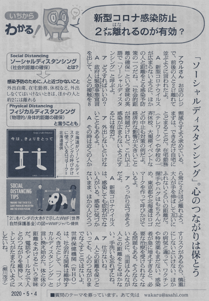 2020年5月4日付朝日新聞朝刊に、実にわかりやすい記事(「『ソーシャルディスタンシング』。心のつながりは保とう」)が掲載され、これを読むとたいへん参考になった。そこには「ソーシャル・ディスタンシング」は「社会的距離の確保」とあり、これを「フィジカル・ディスタンシング」(物理的/身体的距離の確保)とWHO(世界保健機関)が言い換えていることにも触れられている。いずれにせよ、「密閉、密集、密接」の3つの密を避ける感染症対策のポイントと併せて、「ソーシャル・ディスタンシング」というこれまであまり聞かれなかったワードが、今や全世界で最も周知され、日常生活におけるマストとなったのである。
