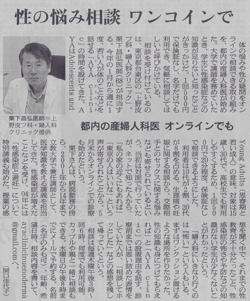 同クリニックのホームページには、このユース外来「AYA Clinic」の窓口となるページ(http://www.uenoderma.jp/aya.html)がある。新聞記事によると、同クリニックの栗下昌弘医師は、病院勤務の傍ら、立教大学の兼任講師を2001年から14年まで務めていた経験があり、「性感染症と避妊」の特別講義をしていて学生らの、性感染症の怖さや予防の知識が不十分であることを知ったという。しかし、婦人科に診療に行くというのは若者にとって“ハードルが高い”ので、まずワンクッション置いて性の知識を身につけて欲しいと、「AYA Clinic」設置の理由を述べていた。ユース外来は当初、対面でおこなっていたらしいが、今年の5月末よりオンラインも始めたという。さらに記事によると、利用者の2割が10代で、8割が20代。生理のことや妊娠に関連した相談、セックスの悩みなどが寄せられているという。