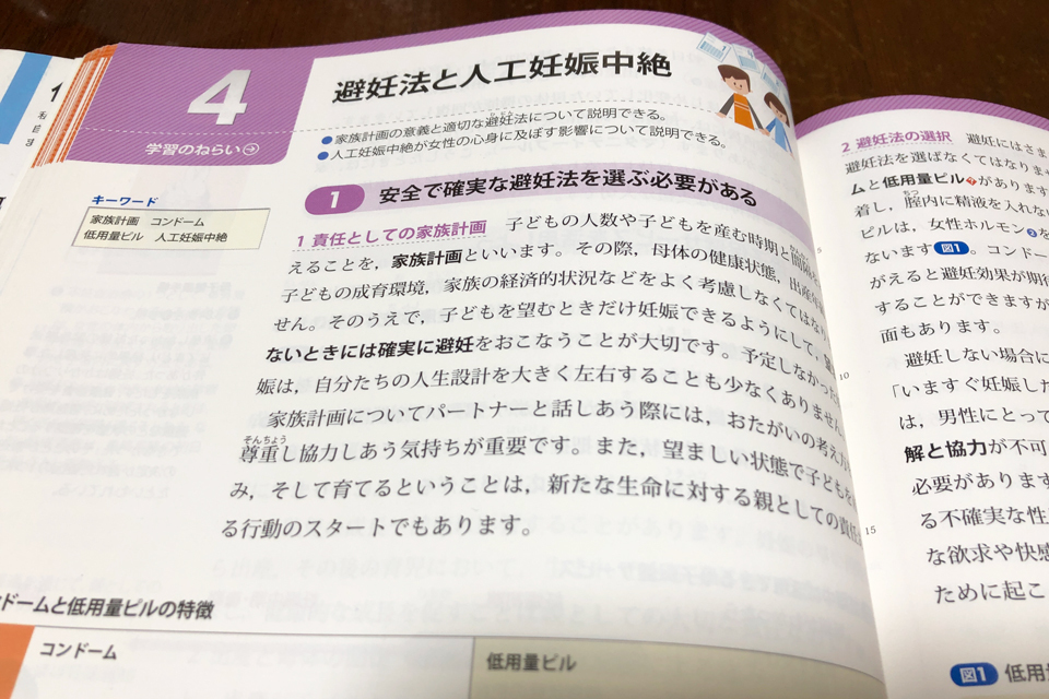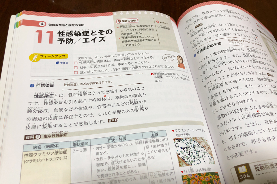 中学校と高校の保健の教科書を開いてみた。すると、成長期のからだの発達のことや生殖のこと、性のこと、心の発達や自己形成、心の欲求不満やストレスについて触れられており、健康被害と予防という観点では、薬物のことや感染症(結核やインフルエンザなど)、性感染症についても学ぶ。