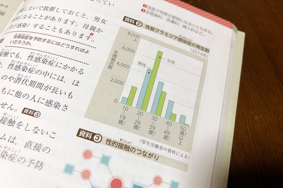 性感染症においては、例えば「性器クラミジア感染症」とか「淋菌感染症」、「性器ヘルペスウイルス感染症」や「尖圭コンジローマ」、「梅毒」が挙げられるが、中学用の学研「新中学保健体育」(平成28年発行)の教科書では、「性器クラミジア感染症の発生数」の厚労省の資料のグラフが掲載されていたりして、男女共20代で最も感染者が多いことが分かる。この教科書では、性感染症の予防には、コンドームが有効な手段であることが書かれている。