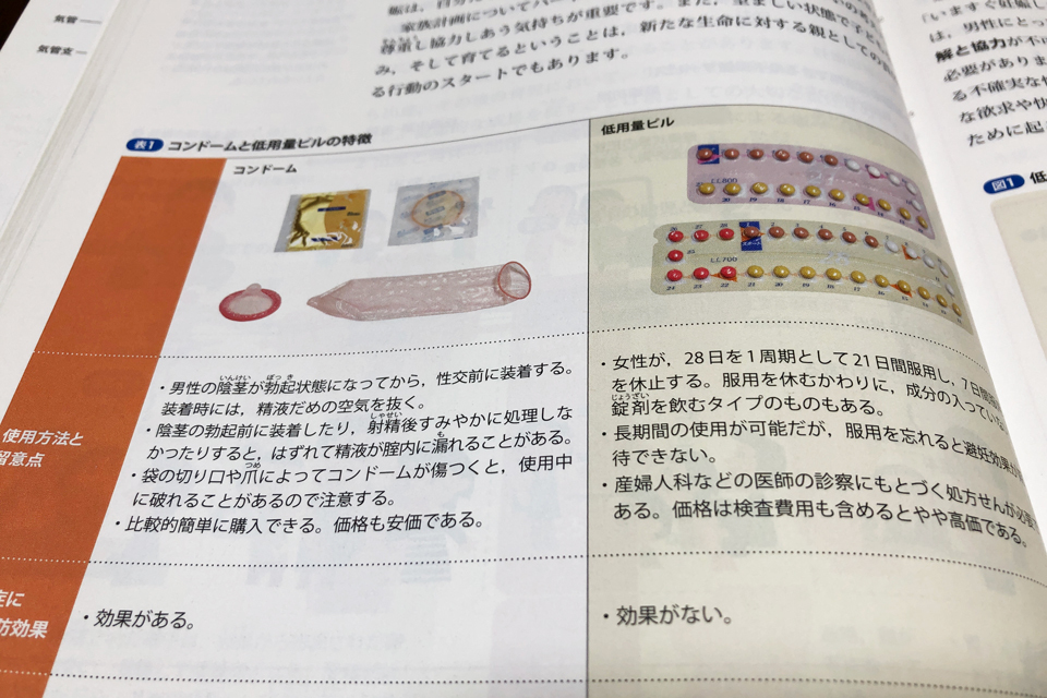 同様にして高校の保健の教科書にも、当然ながら性感染症について触れられていて、コンドームが予防の有効な手段である旨の記述はほとんど変わりない。大修館書店の「最新高等保健体育」(平成29年発行)では、それ以外に、「避妊法と人工妊娠中絶」という項目があり、ここではコンドームと低用量ピルが避妊法として有効である旨が記されている。また別のページでは、産婦人科受診での「緊急避妊法」のことや、「膣外射精」は避妊法としては不確実である旨の記述もあり、教えられるべき点としてはそれなりに詳しい。