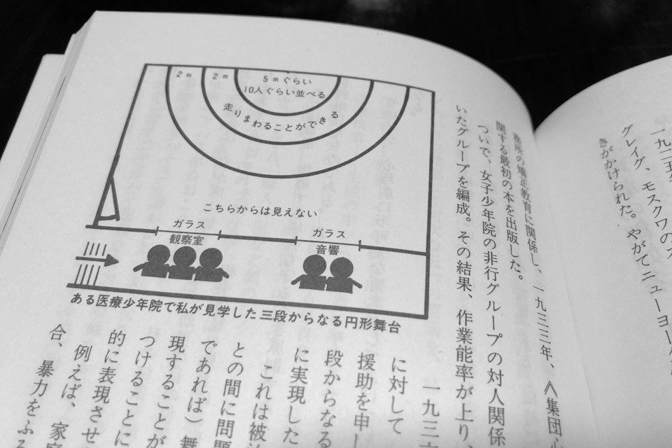 モレノ氏はアメリカに移住後、様々な分野の専門家と親しくなって、精神医学のクリニックを開業した。そうした中、刑務所の矯正教育にも従事し、「心理劇による治療演劇劇場」の構想を実現。三段の段差のある、いわゆる馬蹄形の舞台(円形舞台)を構築し、その3つの段差を劇の中で有効に用い、心理的かつ社会的階級に見立てて、受刑者が演じる演者と演者の心理的な表現(体験)を可能としたのだった。具体的に言うと、高い段からは相手を見下す威圧的な表現に、低い位置からは相手を見上げるといった抑圧的な表現となり、心理的な影響が相互の内面にもたらされることを、舞台上から分かりやすく対象化できるのである。