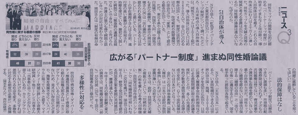 2020年9月9日付朝日新聞朝刊の記事「広がる『パートナー制度』 進まぬ同性婚論義」(筆者は国米あなんだ・西村奈緒美)を読み解く。