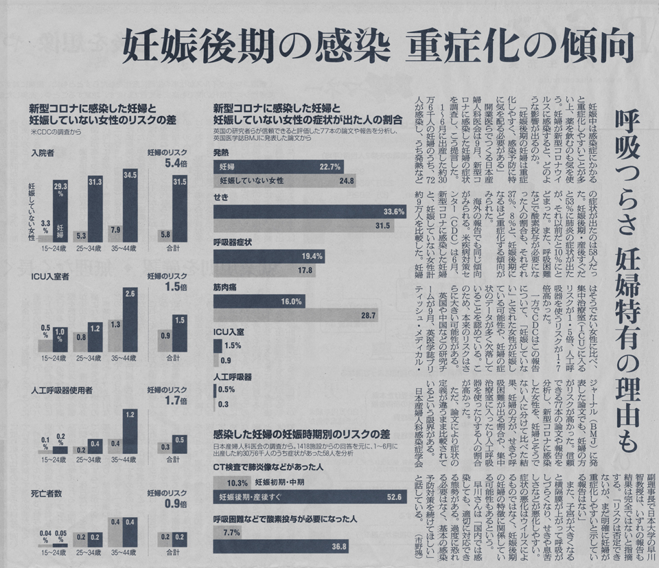 2020年10月25日付朝日新聞朝刊の記事「妊娠後期の感染 重症化の傾向」という見出しは衝撃的だ。何と言っても今年の4月以降、厚労省は「新型コロナウイルス感染症(COVID-19)対策~妊婦の方々へ~」という妊婦さん向けのリーフレット(https://www.mhlw.go.jp/content/11925000/000630988.pdf)を配布し、その中で、