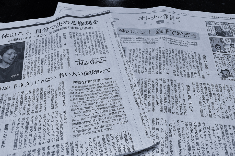 助産師シオリーヌ(本名・大貫詩織)さんが緊急避妊薬をとりまく環境の窮状を訴える市販化の是非の問題は、2020年12月9日付朝日新聞朝刊の記事で取り上げられた。