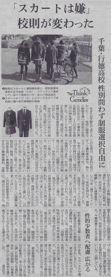 2021年2月17日付朝日新聞夕刊の記事で、“Think Gender”というジェンダーを考えるテーマのシリーズ欄に、「『スカートは嫌』 校則が変わった」「千葉・行徳高校 性別問わず制服選択自由に」という見出しと本文が掲載された。市川市にある県立行徳高校では、女子もスラックスタイプの制服を着ることができるようになり、男子もスカートタイプの制服を着ることができるようになったのである。