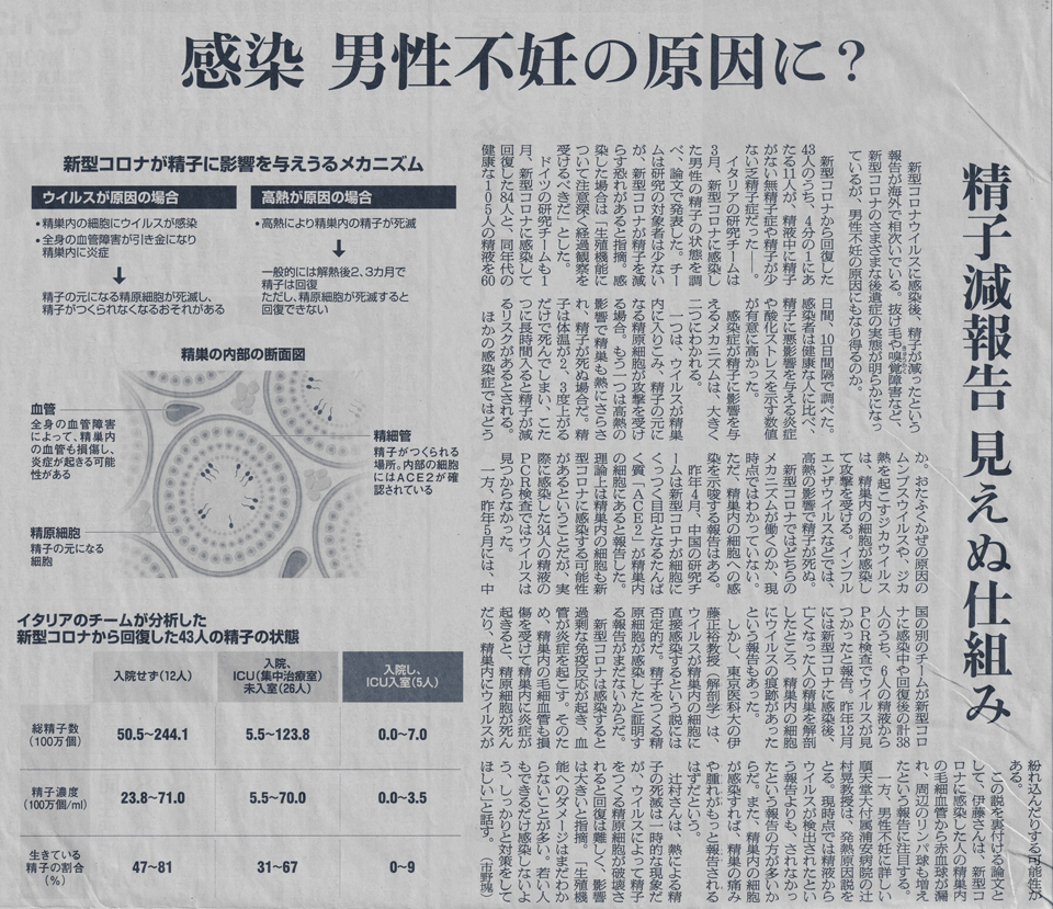 新聞記事によると、イタリアの研究チームの3月の論文発表では、新型コロナウイルスから回復した43人のうちの4分の1にあたる11人が、無精子症や乏精子症だったという。ドイツの研究チームは1月、コロナ感染から回復した84人と同年代の健康な105人の精液を60日間にわたり、10日間隔で調べたという。すると、感染者の方は健康な人と比べて、精子の炎症や酸化ストレスを示す数値が高かったという。