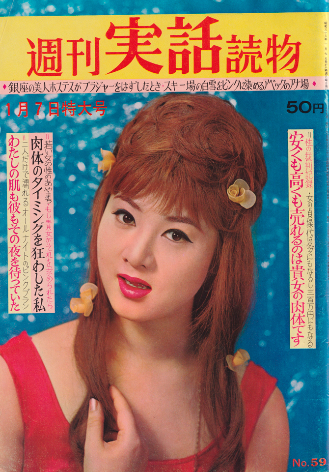 私が今回入手したのは、昭和38年1月に株式会社日本社が隔週月曜日に発行していた雑誌『週刊実話読物』の1月7日特大号である。当時の定価は50円。表紙のモデルは筑波久子さん。雑誌の内容は、おおむね一般人のスキャンダルを扱ったゴシップ誌であり、表紙に掲げられた見出しを読んだだけでも、どういった雑誌なのかは想像できるだろう。