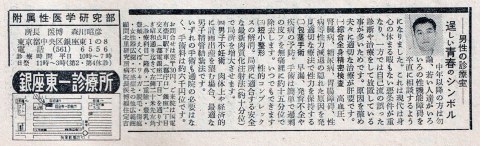 「―男性の診療室―逞しい青春のシンボル」という見出しの銀座東一診療所の広告。《中年以降の方は勿論、若い人たちがいろいろの性機能障碍を率直に相談するようになりました。これは現代は身心の休まる暇もない悪条件が重なり、一方では自己流の誤った診断や治療をして放置している事が多いためです。原因を確かめ夫々に適切な治療が肝要です》。この広告の中に、「包茎手術」という項目がある。