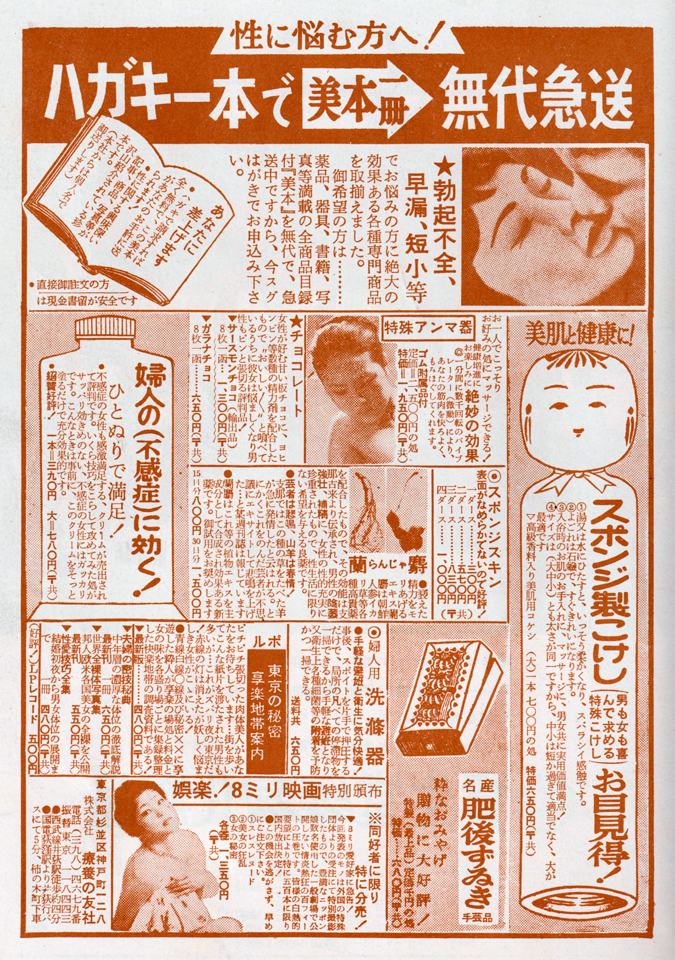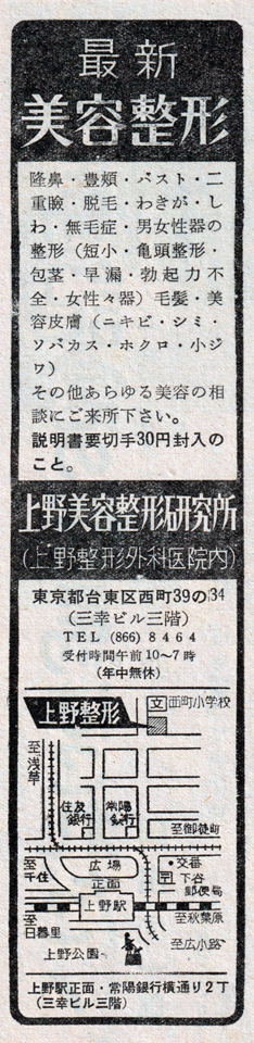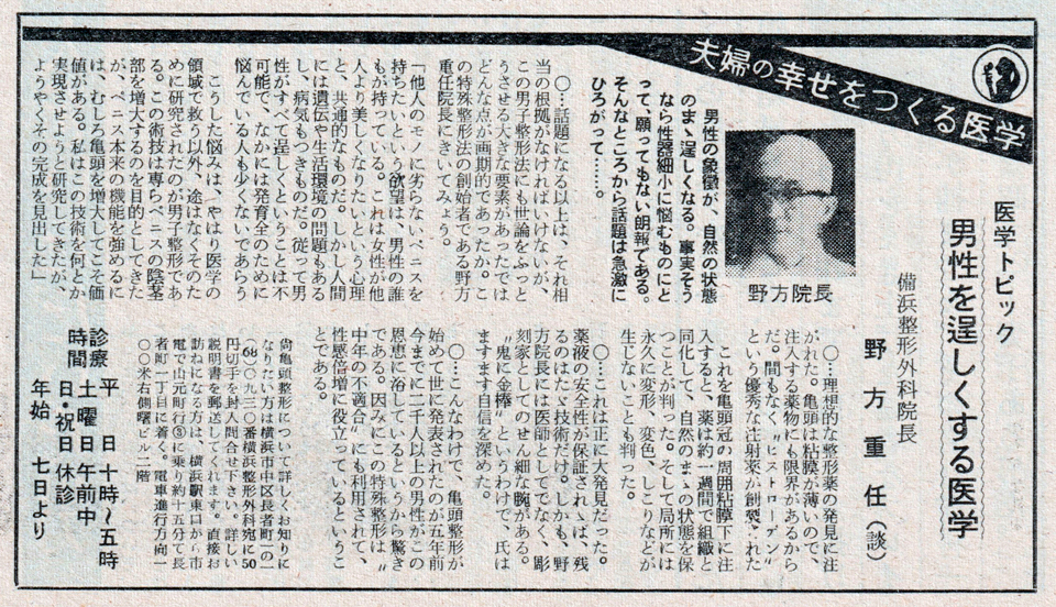 「夫婦の幸せをつくる医学」「医学トピック 男性を逞しくする医学」という見出しが付けられているのは、横浜整形外科の広告。この野方重任院長は「特殊整形法」の創始者だそうである。《…ペニス本来の機能を強めるには、むしろ亀頭を増大してこそ価値がある。私はこの技術を何とか実現させようと研究してきたが、ようやくその完成を見出した》。