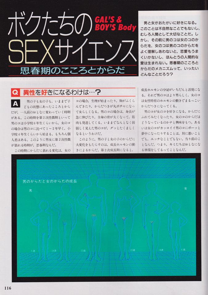 そうして中学生時代に購読していた『UTAN』の、ある号に、それはもう唐突という印象が強いのだけれど、思春期の性に関する記事が掲載されていて驚いたのを憶えている。記事の中の人体モデルの図が、通常のイラストではなく、なんとコンピューター・グラフィックで描かれていたのだ。そうした図は、当時としてはとても斬新であったし、単純に性に関しても好奇心旺盛だったため、私はその号を捨てずに取っておいて、後年その記事のページをスクラップ化して保管しておいたのだった。