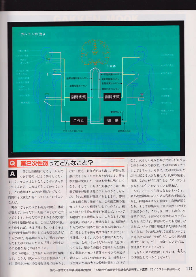 「ボクたちのSEXサイエンス 思春期のこころとからだ」の記事の監修に携わったスタッフを明記しておこう。監修は、《吉祥女子中学・高等学校教頭 “人間と性”教育研究協議会代表幹事山本直英》氏であり、CGイラストは、長谷川一光氏だ。山本氏は残念ながら2000年に亡くなられたが、1982年に“人間と性”教育研究協議会を創設している。
