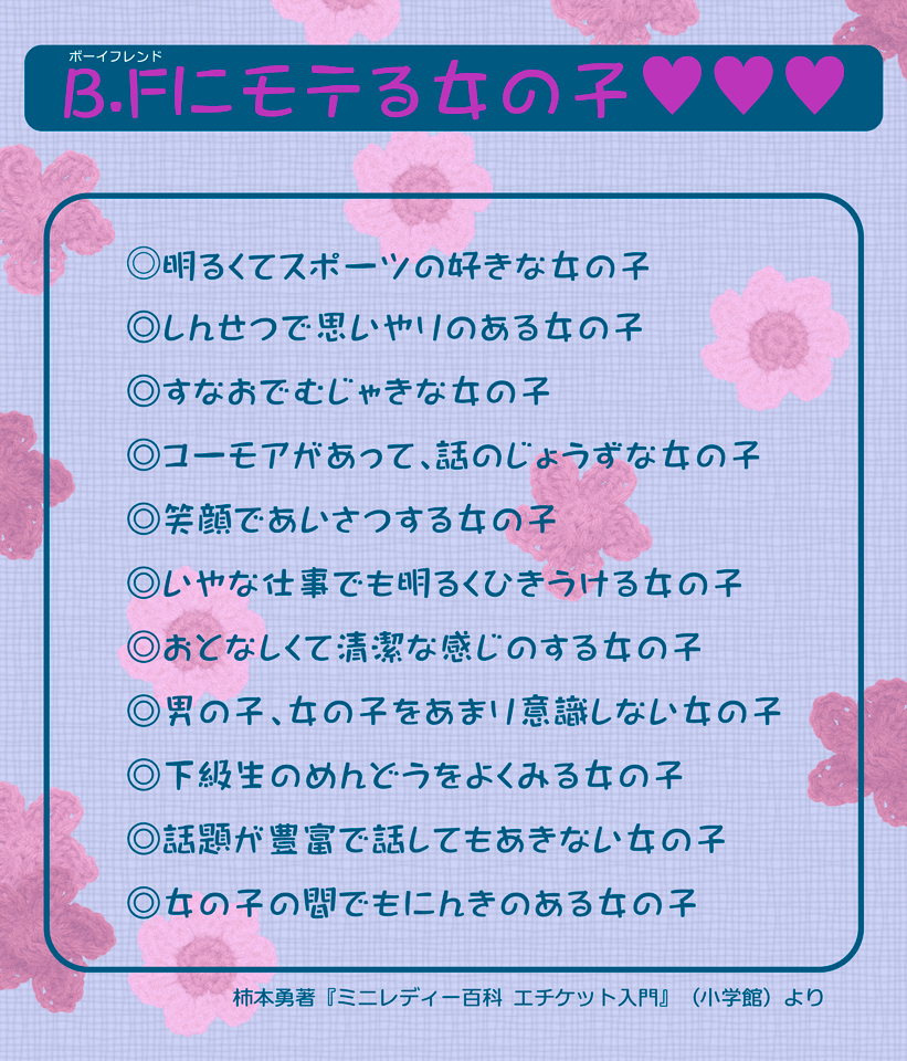 『エチケット入門』の読者層は小学生や中学生くらいの子ども達を想定しているので、特に小中学生における友達間のエチケット及びマナーを指す。私がここで取り上げようとしているのは、女の子がボーイフレンド(男の子)の友達をもった時のエチケット及びマナーということになる。