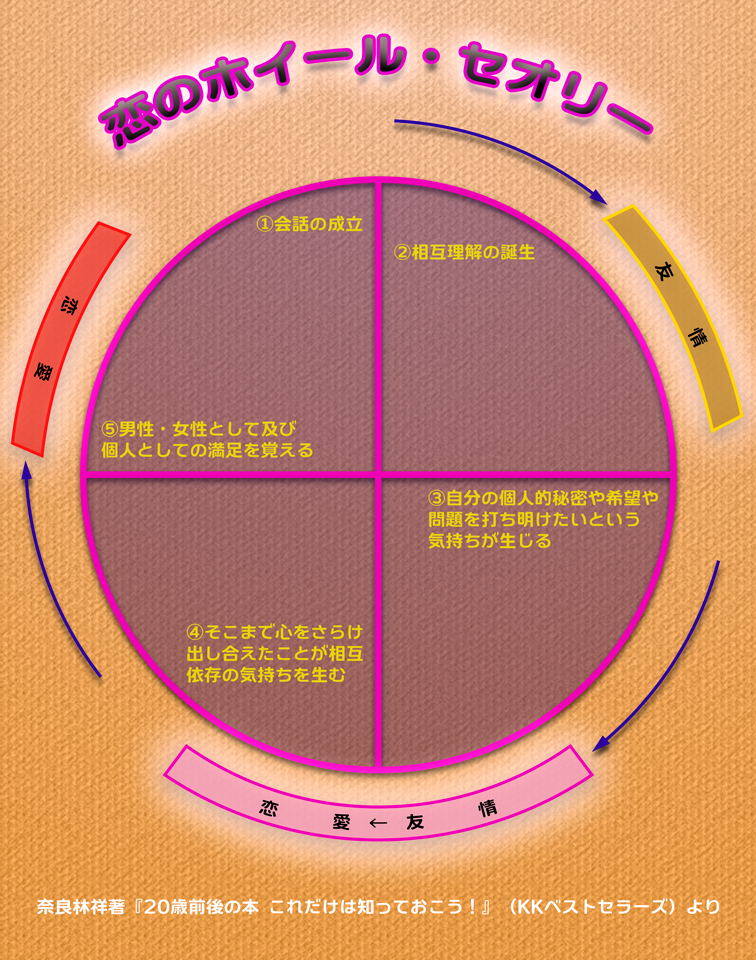 奈良林氏の本の中で、若い頃に友人として知り合えた男女が、やがて親しくなって恋愛するにいたる、その心理的プロセスを見事に図形化した画期的な教示があるので、ここで紹介しておこう。それは、「恋のホイール・セオリー」である。