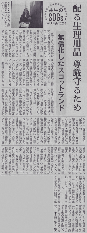2021年11月14日付朝日新聞朝刊の一面。見出しは「配る生理用品 尊厳守るため」。「無償化したスコットランド」。