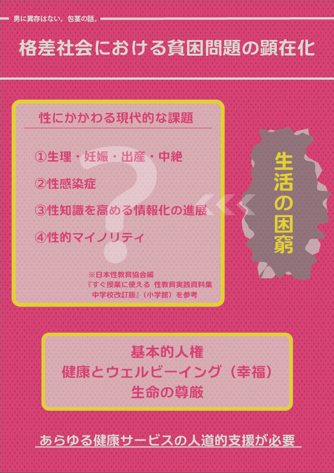 端的にその具体例が、まさに「生理の貧困」という社会問題となって現れてきていることに、我々は早く気づかなければならない。これまで盲点だったのは、個人の性にかかわる現代的な課題として挙げられる「妊娠・出産・中絶」、「性感染症」、「性情報の進展」、「性的マイノリティ」への正しい理解や矜恃が、貧困という状況に陥った時、いくら誠意あれども個々で不完全さをもたらしかねないということである。