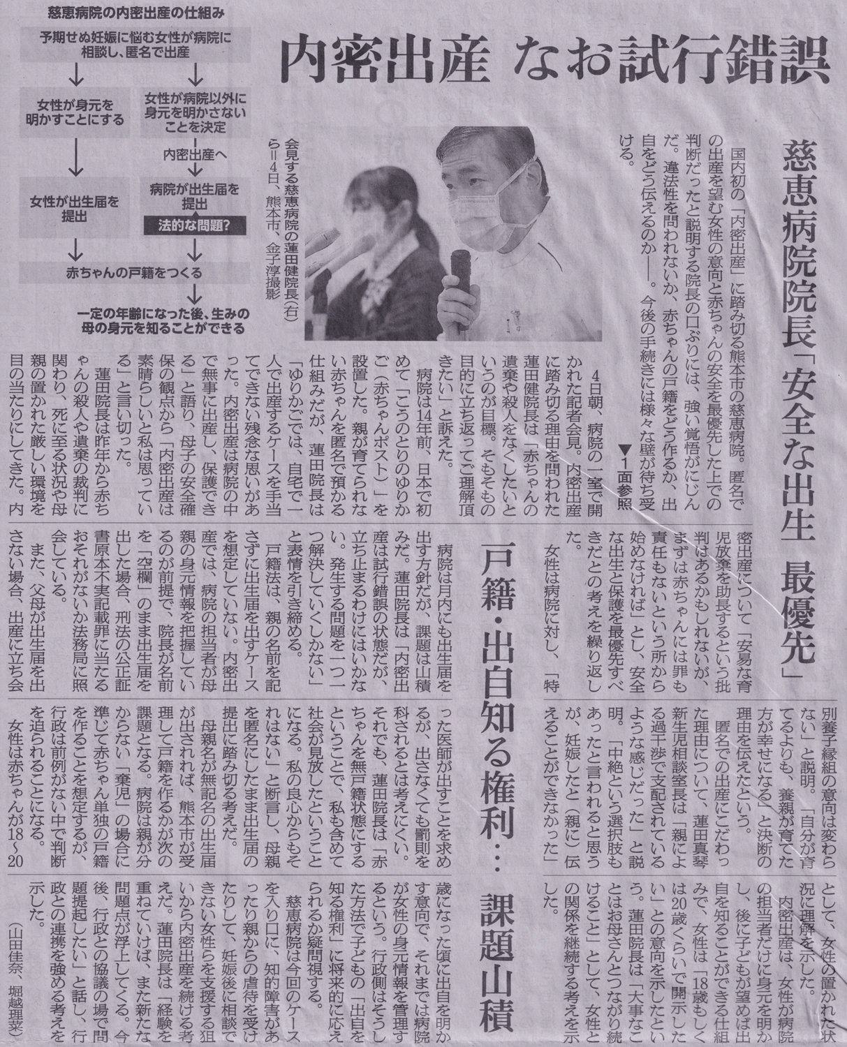 2022年2月9日付朝日新聞デジタルでは、「母子支援で熊本市協力へ 現状踏まえ方針転換」という見出しの記事が配信された。これまで熊本市は、慈恵病院のおこなう「内密出産」は法に触れる可能性があるため協力に消極的であったが、子どもの権利擁護の観点から方針転換し、「内密出産」をせざるを得ない女性の現状を踏まえ、孤立出産をふせぐための情報共有や話し合いの場を持つことで合意したという。今後、熊本市は、「内密出産」に係る必要な法整備について国や国会議員に働きかけていく方針だ。