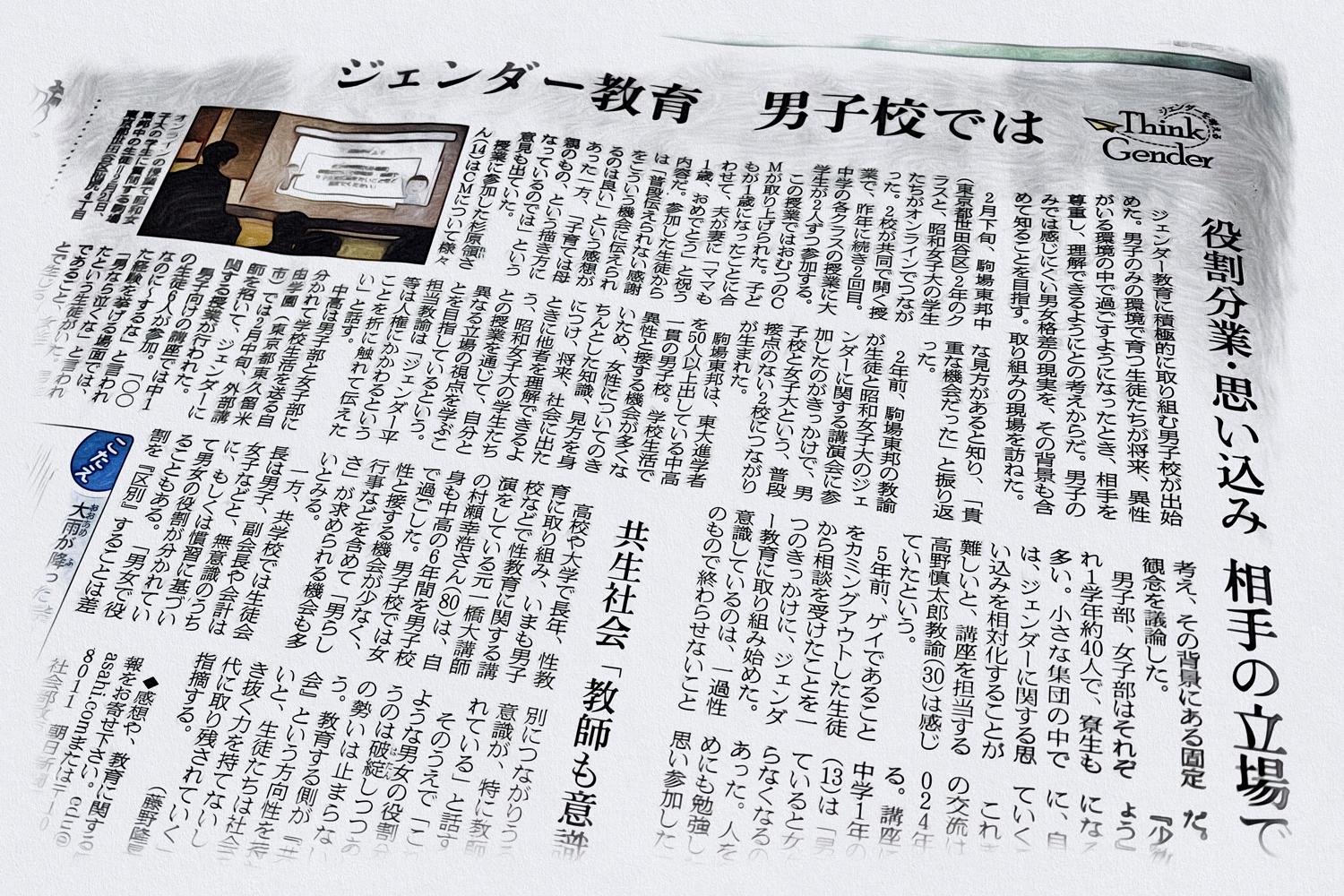 2022年3月7日付朝日新聞朝刊に、「ジェンダー教育 男子校では」という記事が掲載された(記者は藤野隆晃)。大見出しは「役割分業・思い込み 相手の立場で考える」、小見出しは「共生社会『教師も意識を』」。