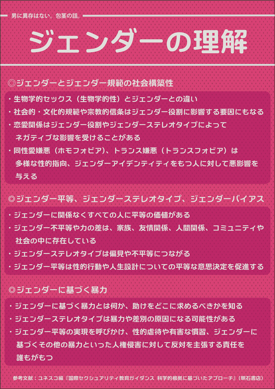 ジェンダー教育で必要な観点とは何か? ユネスコの『国際セクシュアリティ教育ガイダンス』より抜粋し、「ジェンダーの理解」の画像にまとめておいたので、それをぜひ参考にしていただきたいと思う。